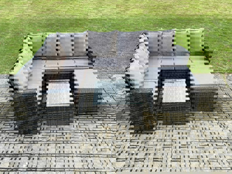 Finished in dark grey mixed rattan with dark grey fabric, the set includes a square coffee table with a transparent tempered glass top, secured with suckers to help prevent sliding. Flat packed for convenience, it is supplied for easy assembly and can be rearranged to suit your space.