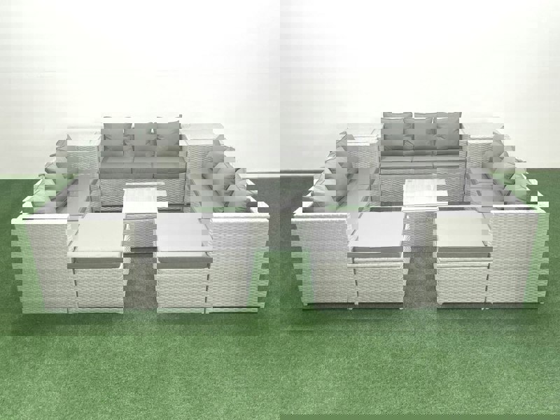 Create a refined outdoor seating area with this rattan sofa set, designed for patios and gardens. Made from PE rattan with a galvanised steel structure, it is built for strength and durability in outdoor conditions throughout the year, while the coordinated light grey mixed rattan and dark grey fabric bring a considered finish to your space.