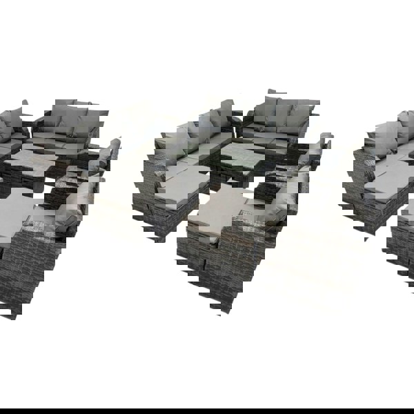 Finished in dark grey mixed rattan with dark grey fabric, the set includes adjustable reclining chairs for personalised comfort, plus a coffee table topped with tempered glass to create a practical centrepiece for drinks and snacks.