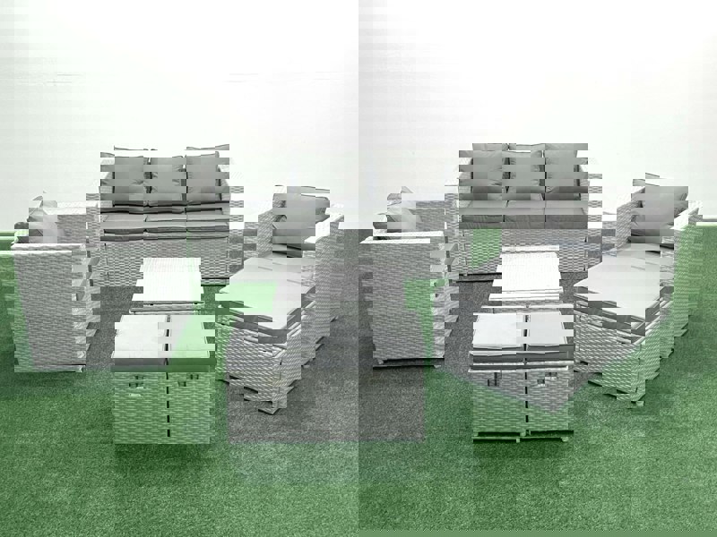 Finished in light grey mixed rattan with dark grey fabric, the set is made for relaxed lounging, with 8cm thick seat cushions and soft pillow back cushions. The coffee table is topped with 5mm clear tempered glass, secured with a sucker to help prevent sliding.