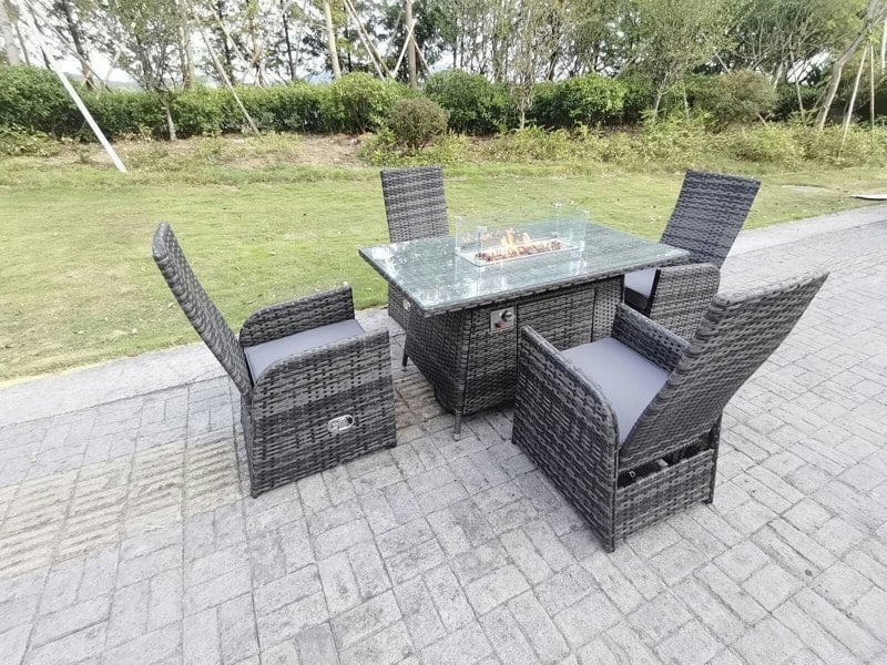 Create an inviting setting for outdoor dining with the Fimous rattan gas fire pit dining set, designed for patios and gardens. This deluxe set pairs a rectangular table with a gas fire pit feature, offering a practical centrepiece for everyday use as well as relaxed gatherings.