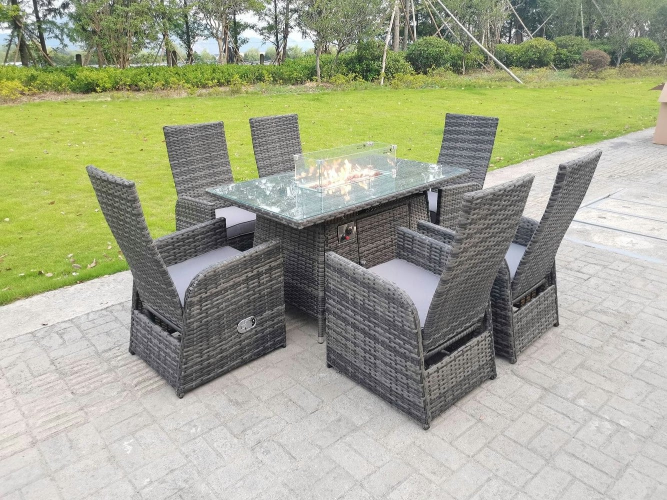 This deluxe gas fire pit rattan dining set is designed for relaxed outdoor dining, bringing guests together around a rectangular table with an integrated gas fire pit. Finished with a transparent tempered glass tabletop, it is made for everyday use on the patio or in the garden.