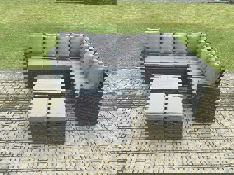 This PE rattan outdoor corner sofa set is designed for relaxed patio or garden seating, with a coordinated corner layout, coffee table and footstools for flexible outdoor entertaining. Built with a galvanised steel tube frame and powder coating to help prevent rust, it is made to feel sturdy and durable.