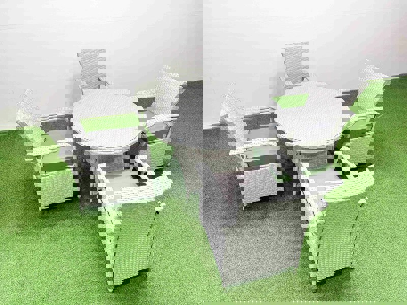 Finished in light grey mixed rattan with dark grey fabric, the set includes a round table topped with transparent tempered glass and four chairs with thick seat cushions. Supplied flat packed, it is designed to be easy to assemble and simple to reposition around your outdoor space.