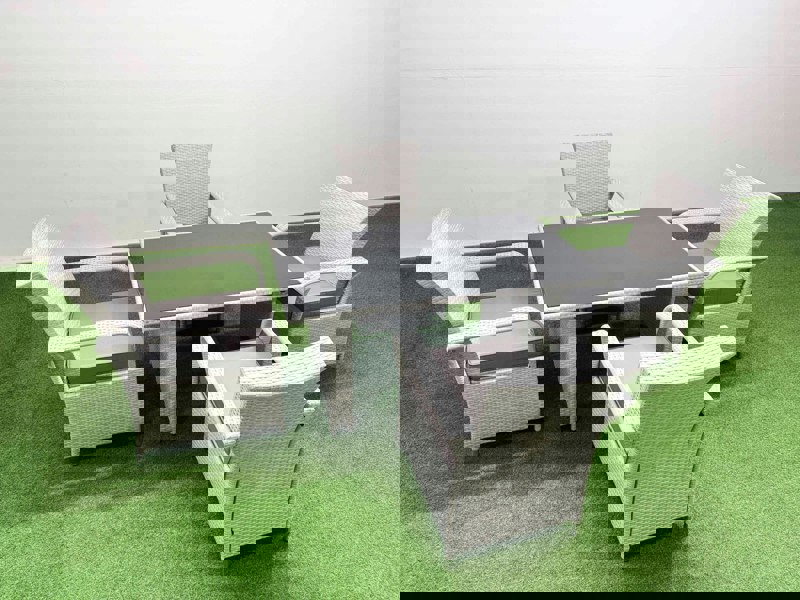Made with flat, handwoven PE rattan and galvanised steel tube frames, the set is built for lasting use outdoors. The table is finished with black tempered glass, while the chairs include seat cushions with removable covers for easier upkeep.