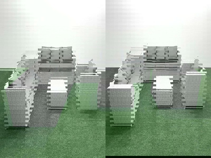 This deluxe rattan sofa set is designed to elevate patios and gardens with comfortable seating and coordinated tables for outdoor living. Made for everyday use, it combines a practical layout with supportive cushions, creating an inviting space for relaxing and entertaining.