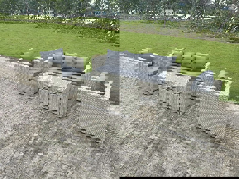 Designed for outdoor lounging and entertaining, this classic sofa set seats up to 7 people and pairs a comfortable seating layout with soft back cushions. Finished in mixed rattan with coordinating fabric, it brings a considered look to patios and gardens while remaining practical for everyday use.