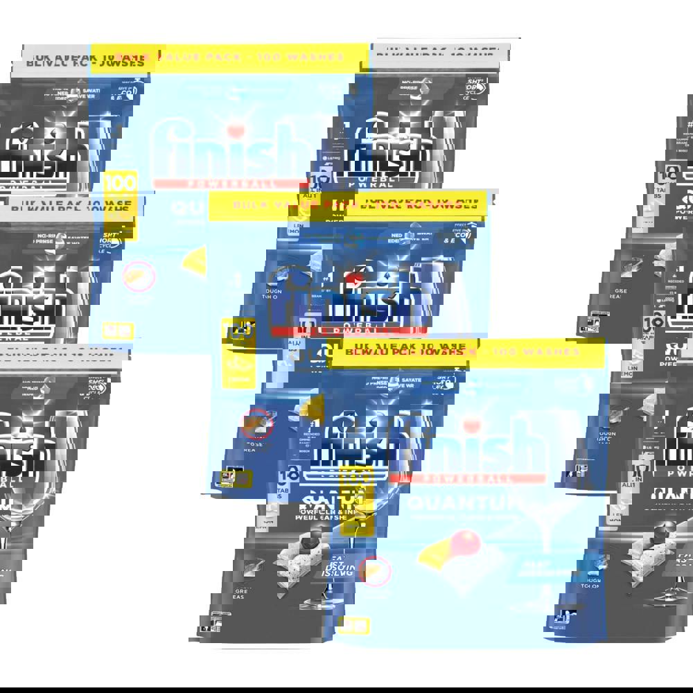 Finish is a leading brand in dish care trusted by top dishwasher manufacturers for delivering powerful reliable cleaning results. The Finish Quantum All in 1 Dishwasher Tablets in Lemon Sparkle provide an advanced triple-chamber formula that tackles tough stains removes dried-on food and delivers a superior shine on dishes glasses and cutlery.