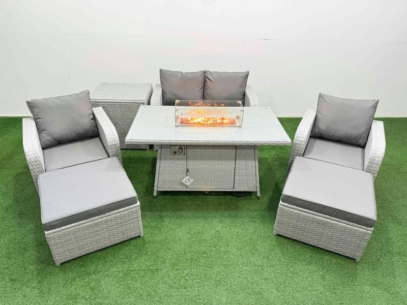 Outdoor PE Rattan Garden Furniture Gas Fire Pit Dining Table Armchairs With Big Footstool Light Grey