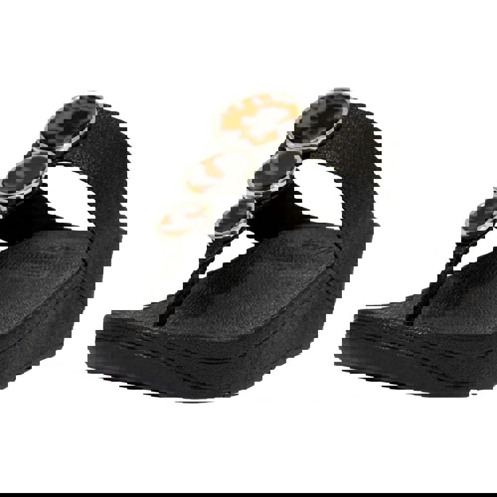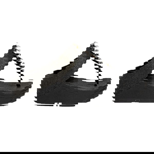 These women’s Halo Shimmer toe post sandals combine a slip-on fastening with a platform heel for an easy, streamlined finish. The upper and insole are made from synthetic material, while the midsole uses a Microwobbleboard construction. A microfibre toe section and cushioned feel complete the structure.