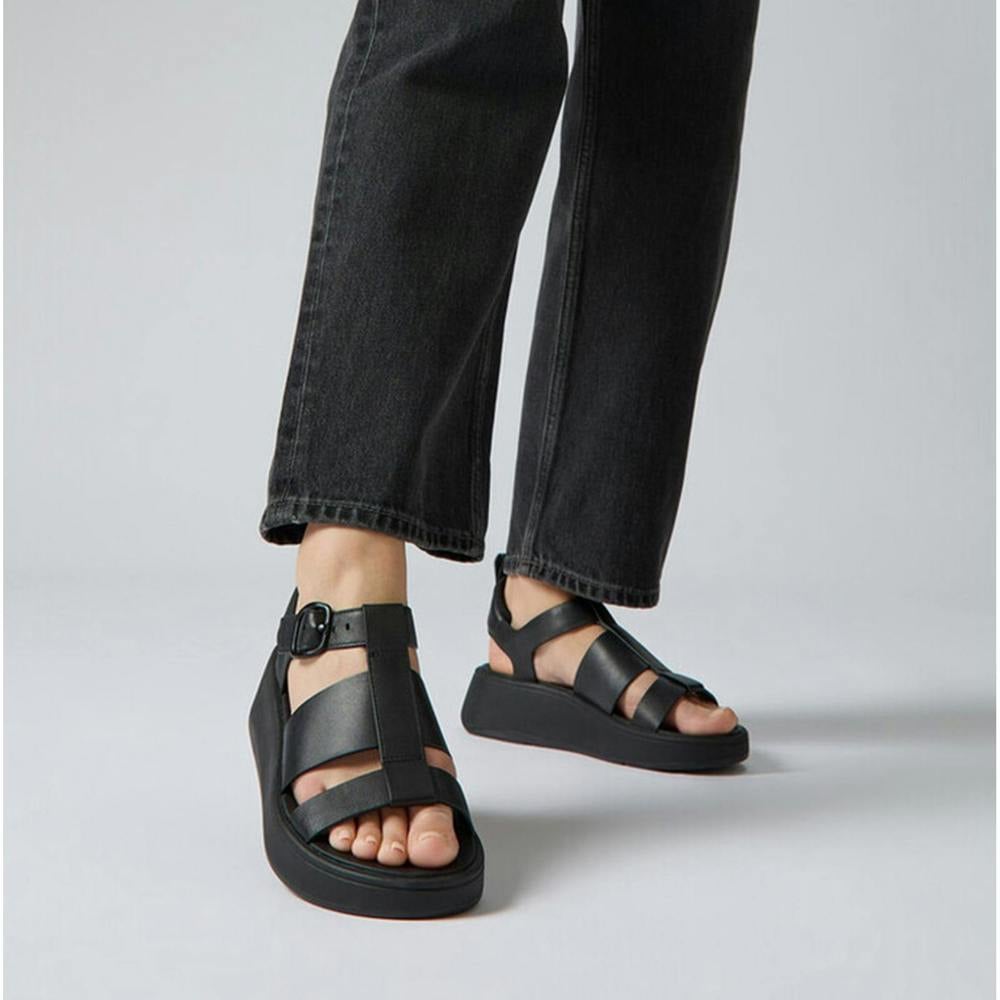 Ankle strap sandals with leather upper and lining, featuring a medium platform heel and open toe. Equipped with a microwobbleboard sole for comfort and a buckle closure
