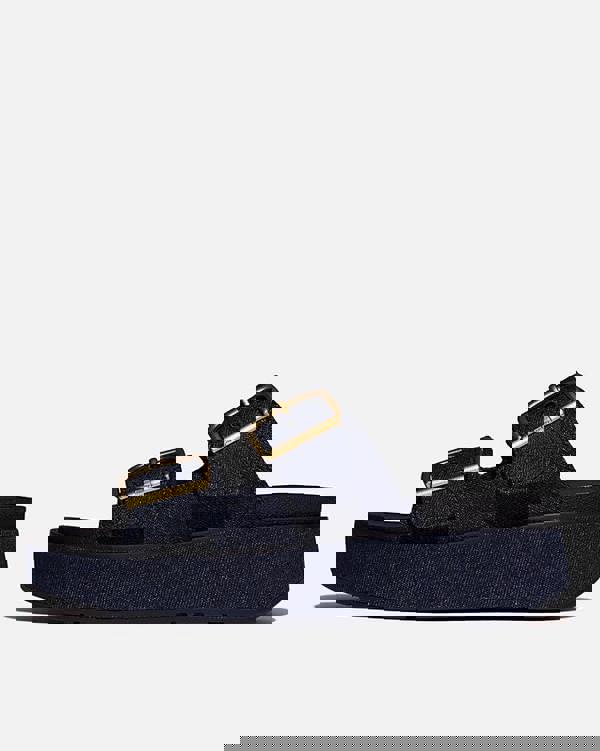 Bring a confident, denim-led finish to summer looks with FitFlop GEN-FF Max Buckle Two-Bar Denim Slides, women’s flatform slides in dark-indigo denim. Based on the Gen-FF sandal shape, the upper is made from a polyester-cotton blend and set with two wide front straps. Gold-toned buckle fastenings adjust the fit, keeping the silhouette clean and considered.