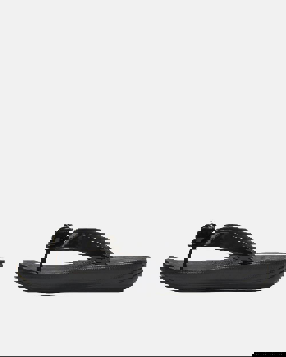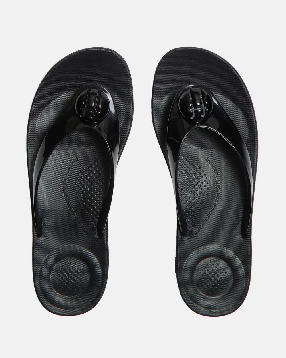 FitFlop brings a polished finish to warm-weather essentials with the Womens iQushion Glossy-Button Flip-Flops, a lightweight slip-on style in black. Built around iQushion air-foam cushioning, the footbed uses tiny micro-bubbles to absorb impact while supporting the heel and forefoot. A wide, glossy front strap is finished with subtly logo-embossed button detailing, keeping the look clean and considered for everyday wear.