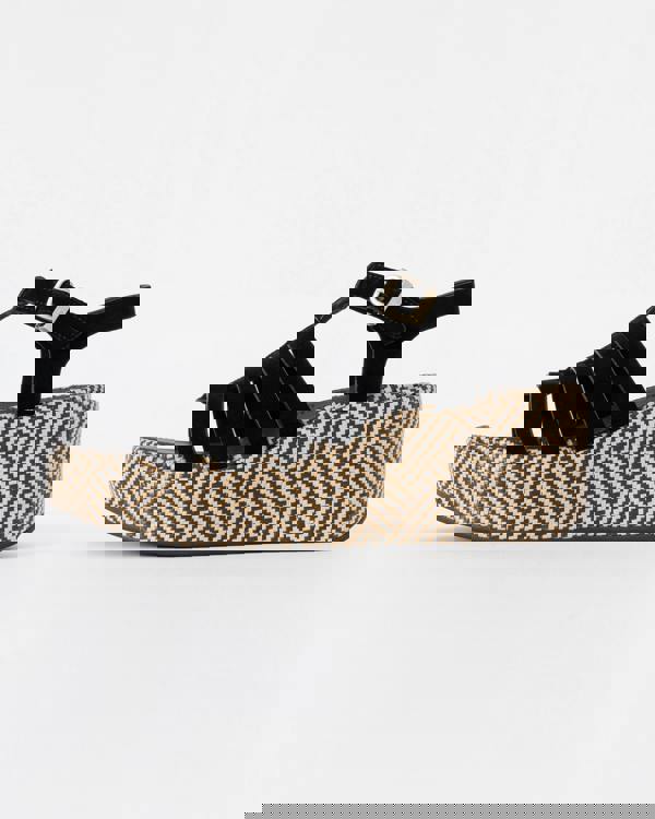 FitFlop A5O platform sandals bring a bold, structured look to warm-weather dressing. Made for women, this fisherman-style pair is finished in black suede across the upper and straps, with graphic-weave detailing that adds texture to the silhouette. A platform profile gives the design its distinctive lift, while gold-tone hardware sharpens the finish.