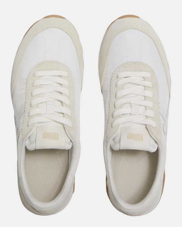 FitFlop brings a vintage-inspired look into the present with the Retro-Q FF Fabric/Suede Trainers, a women’s lace-up trainer finished in Urban White Mix. Drawing on retro sneaker styling, the upper combines nylon, leather and suede to create a layered, textural profile. Inside, an antibacterial mesh lining adds a considered touch for everyday wear.