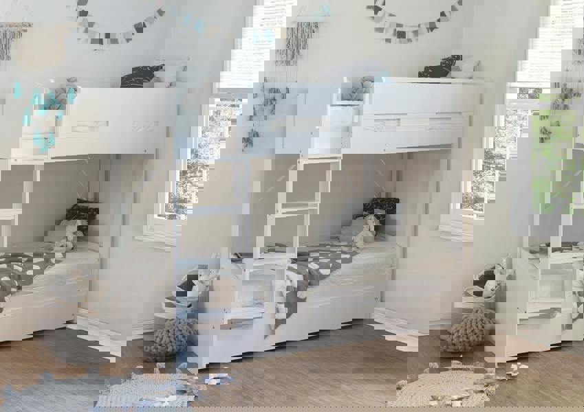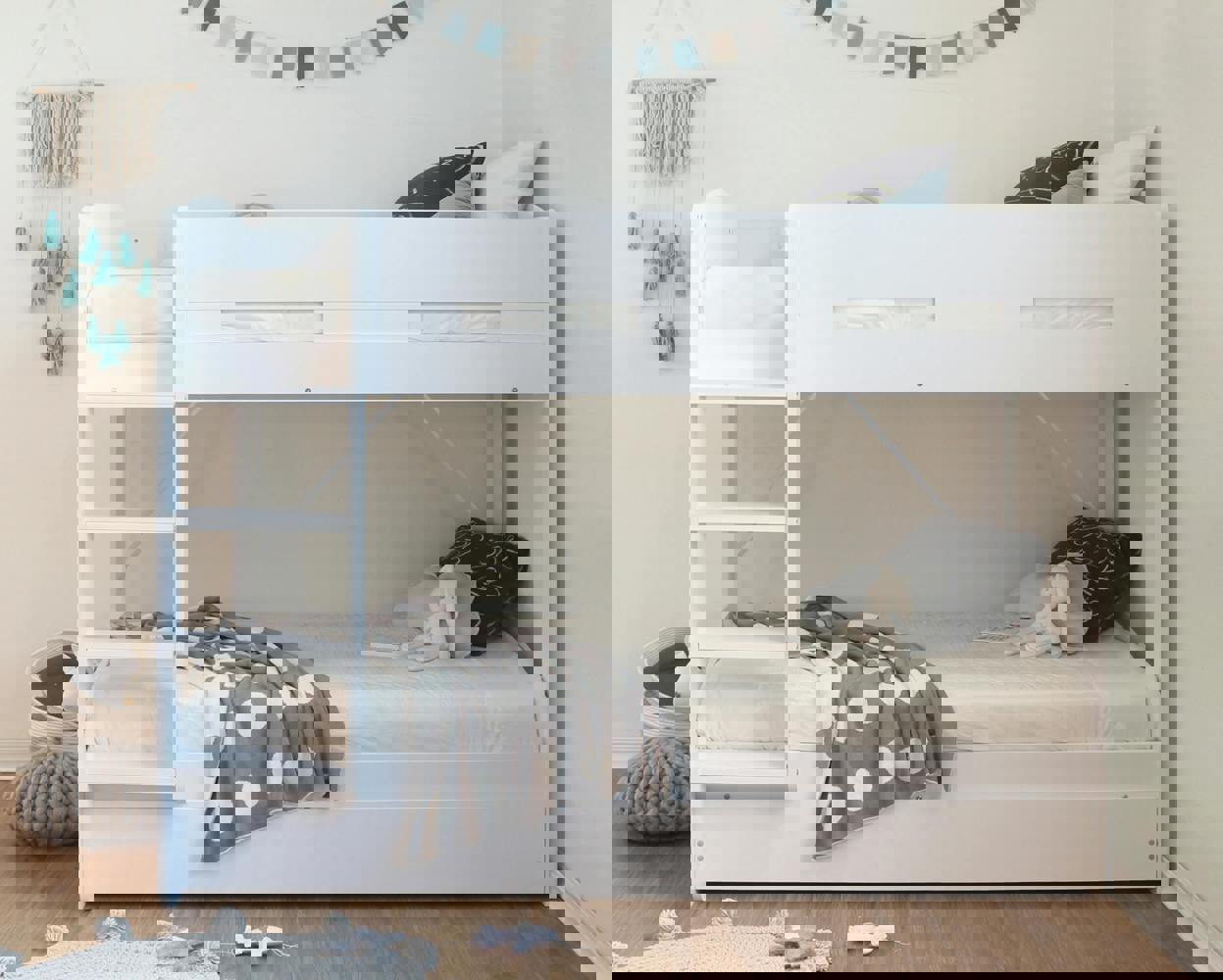 A pull-out drawer beneath the lower bunk transforms the bunk bed into a triple sleeper. The drawer is large enough to accommodate an additional single mattress, offering a flexible solution for sleepovers or shared rooms.