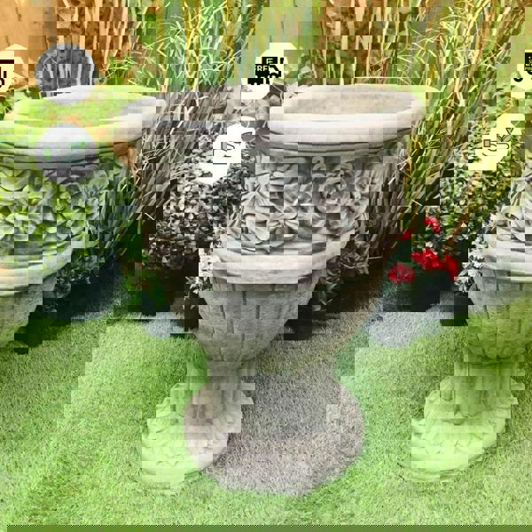 Add timeless elegance to your outdoor space with this beautifully crafted stone cast decorative garden vase. Designed with intricate floral carvings around the rim and a classic base, this vase brings a touch of vintage charm to any setting. Not only is this ornament beautiful to look at but it’s also exceptionally durable and weather resistant. Perfect for showcasing vibrant flowers or other plants, this vase will become a stunning focal point wherever it’s placed.