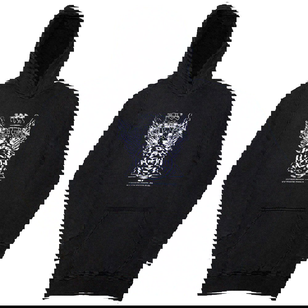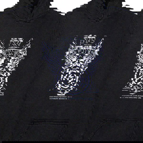 Official licensed Foo Fighters Unisex Pullover Hoodie featuring the 'Everything Or Nothing At All Logo' design motif. High quality charcoal grey unisex pullover hoodie featuring stone wash cotton with hood (no drawstring) and kangaroo style pouch pocket. With front printed motif. Comes in a wide range of sizes from Small through XX-Large, subject to availability.
