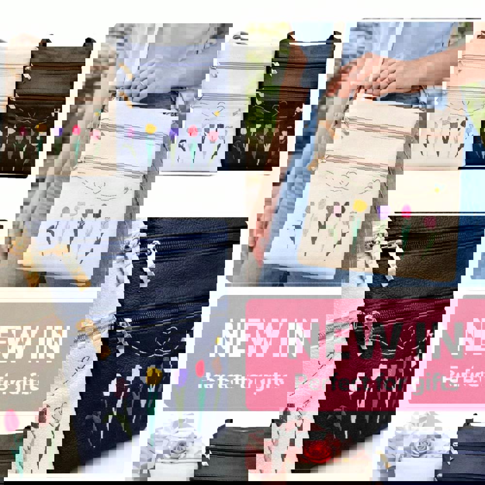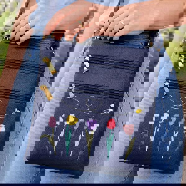 Add a fresh and feminine touch to your everyday accessories with this beautifully embroidered tulip and bee crossbody bag. Featuring a charming floral garden design, this lightweight handbag is perfect for daily use, shopping trips, travel and days out.