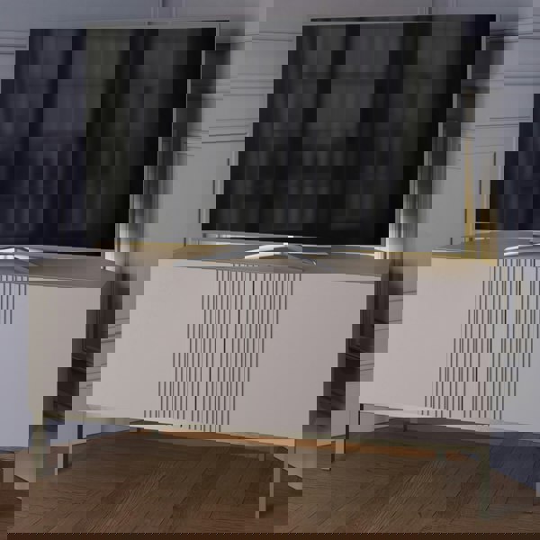 Beautiful two door corner TV unit with a subtle fluted design and striking brushed nickel legs. This striking piece has ample storage.