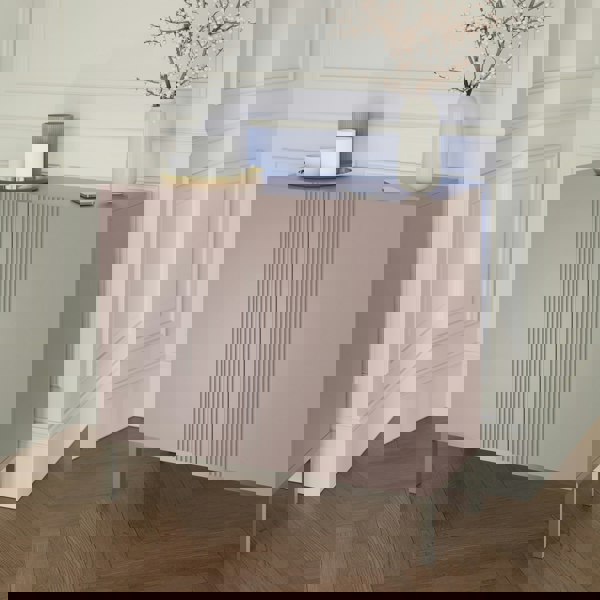 Beautiful two door sideboard with a subtle fluted design and striking brushed nickel legs. This versatile piece can be used for storing tableware and would make the perfect drinks cabinet, with space for wine, spirits, and glassware.