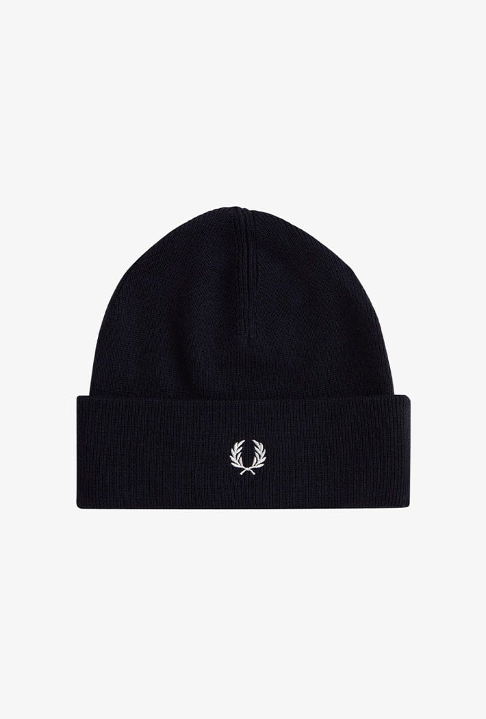 Our ribbed cotton and RWS merino wool blend beanie with the embroidered Laurel Wreath placed front and centre.