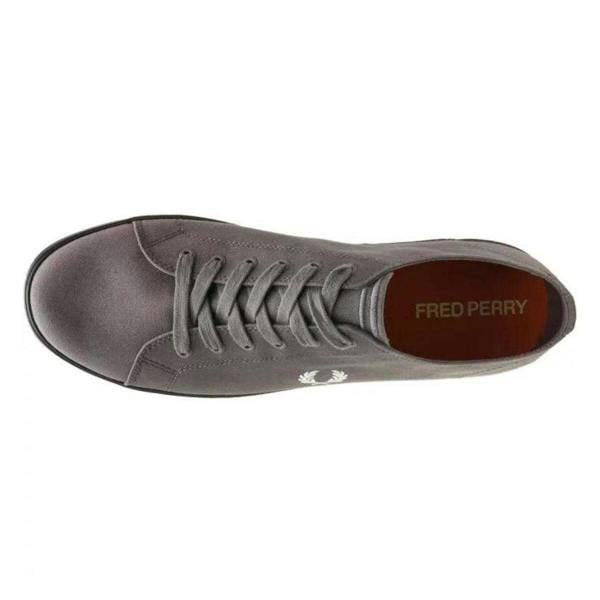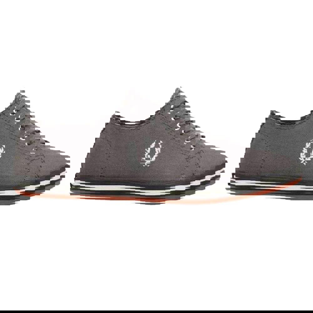 Fred Perry Kingston Twill trainers in grey with a low-cut profile and a flat sole. The upper combines synthetic and twill materials, finished with a plain design and logo detail. A round toe keeps the shape classic, while the lace-up fastening threads through six eyelets for a secure fit. Synthetic components continue through the insole and outsole for a consistent finish.