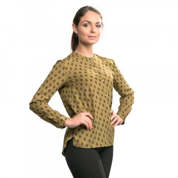 In a rich hue and artful pattern, the Elise Crepe light shirt will bring vibrancy to your ensemble. It is collarless with a half button placket, cuffed sleeves and a relaxed fit. Wear yours with black jeans and ankle boots for a staple smart-casual choice.