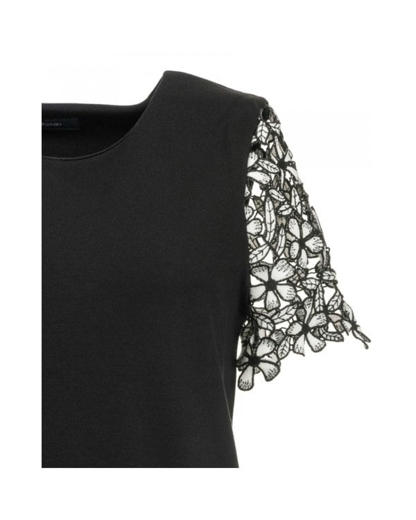 French Connection’s Flaga Floral Lace Short Sleeve Round Neck Tunic is a women’s top in Black/ Summer White. Styled as a tunic, it pairs floral lace with a round neckline and short sleeves for a clean, considered finish.