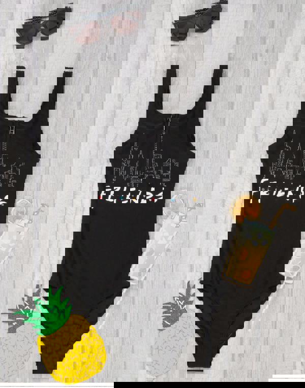The Friends swimming costume for girls comes in black, contrasting against the Manhattan City skyline print underlined with the famous sitcom TV show's logo, Friends, making a must-have Friends swimwear outfit for summer