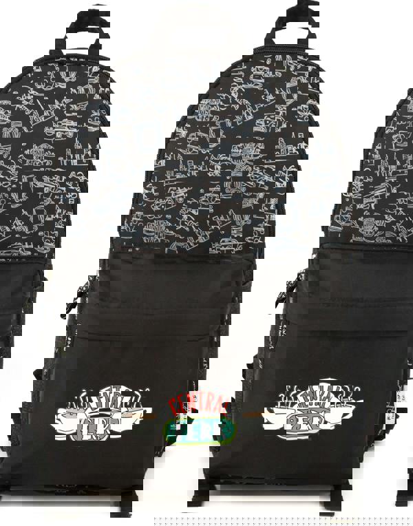 Featuring the instantly recognizable Friends logo in crisp white on the front pocket and an all-over print on the main pocket against a black background inspired by the famous coffee shop and hangout of the Friends gang