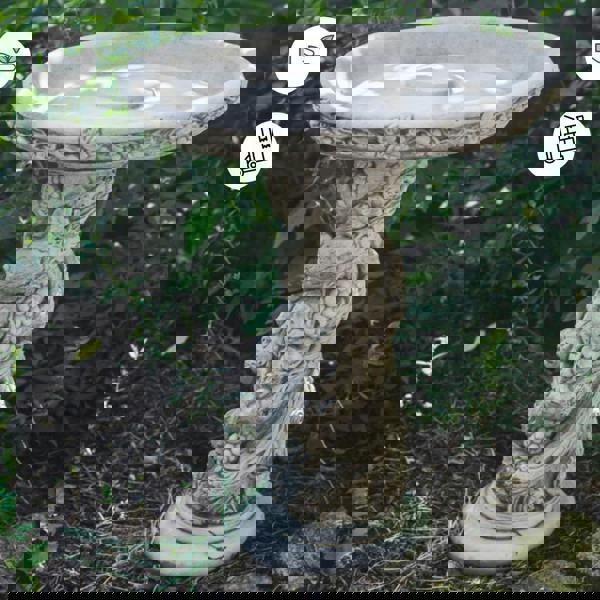 A fancy birdbath in antique style featuring fruits perplexed with vine leaves and branches along the pedestal and engraved along the rim of the bowl. A classic vintage style of this birdbath will please to the eye of your guests and will draw attention to your garden. The piece of garden art will serve for years to come due to the strengths, durability, weather and damage resistance of concrete. Bring nature and elegance to your exterior with this unusual birdbath.