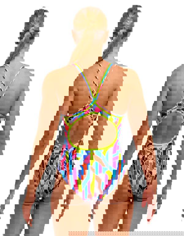 Engineered by Funkita for serious swimmers, the Fault Lines Diamond Back Swimsuit combines a beautiful organic pattern in blues, yellows, blacks and blues, with performance-driven construction. The reinforced double-bind straps in neon green, deliver superior shoulder and bust support, while the front-lined design and mid-rise leg cut offer optimal fit and coverage during rigorous training sessions. Built from Eco C-Infinity fabric, this suit resists chlorine degradation and maintains its integrity through intensive pool use, making it an investment in consistent, reliable performance.