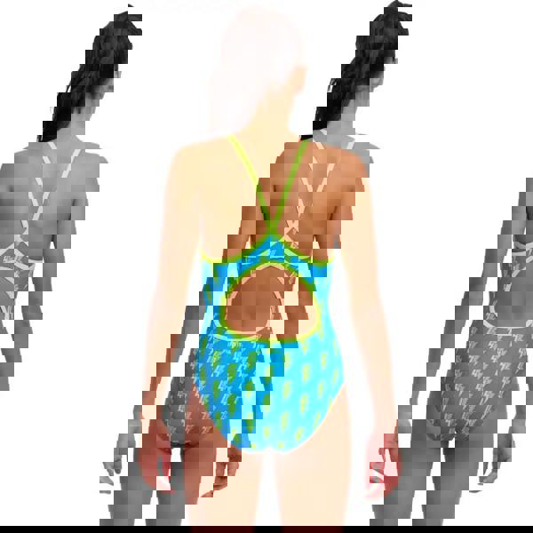 The Girls Bolted Diamond Back Swimsuit features graphic lime lightening bolts all over the swimsuit on a background of turquoise. The single bind shoulder straps in lime green and a diamond back provide freedom of movement while the front lining and fabric panels across the back will offer comfort and support when swimming. There is also modest rear coverage to keep you covered while swimming. Designed from ECO C-Infinity fabric made from end-of-life plastic water bottles, this swimsuit offers high chlorine resistance and great durability, making it perfect for regular swimming sessions and training.