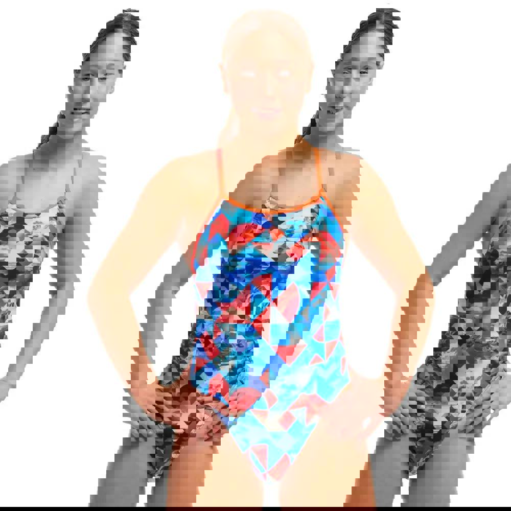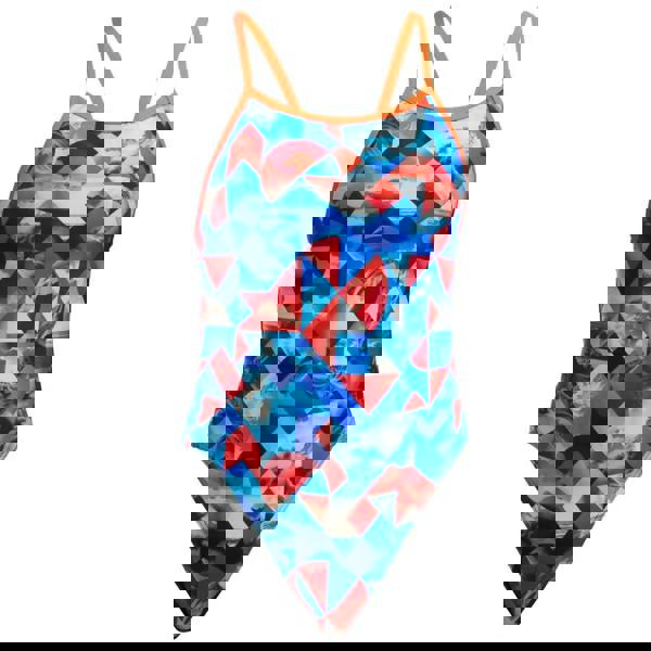 The Girls Big Swell Single Strap Swimsuit from Funkita features a stunning, geometric pattern of blue and red. There are single, orange shoulder straps for freedom of movement and a medium leg and full front lining for modest coverage and a supportive swimsuit. Made from ECO C-Infinity fabric, the swimsuit offers high chlorine resistance for great durability.