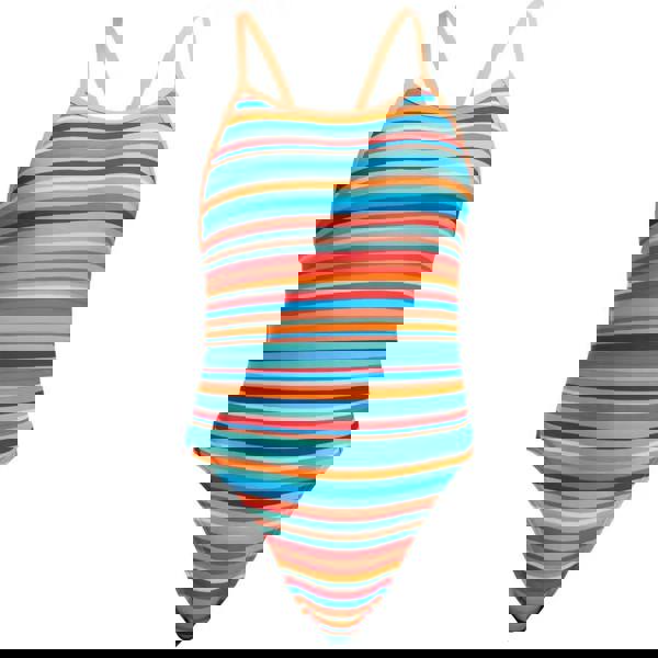 The Girls Ripe Stripe Single Strap Swimsuit from Funkita features classic, horizontal stripes in tones of blue and orange. There are single, orange shoulder straps for freedom of movement and a medium leg and full front lining for modest coverage for a supportive swimsuit. Made from ECO C-Infinity fabric, the swimsuit offers high chlorine resistance and great durability.