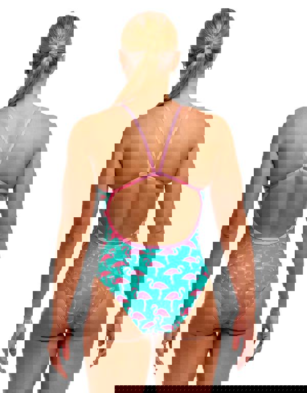 Designed for dedicated swimmers, the Go Flamingo! Single Strap Swimsuit from Funkita features fun, pink flamingoes on a green background. The thin single strap in pink, promotes unrestricted shoulder mobility and an open back configuration. The medium-cut leg and integrated front lining provide balanced coverage without compromising comfort. Built from Eco C-Infinity technology, this suit withstands intensive chlorine exposure and maintains structural integrity through countless training sessions, making it an excellent choice for competitive and recreational swimmers alike.