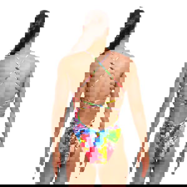 The Ink Jet Strapped In Swimsuit from Funkita features single bind straps in lime, which criss cross down your back, making it perfect for regular pool use, or for recreational and performance-based swimming. The thin crisscross straps, open back and high leg provide greater freedom of movement while the full front lining ensures moderate support. Made from Eco C-infinity fabric, the swimsuit is durable and offers 100% chlorine resistance.