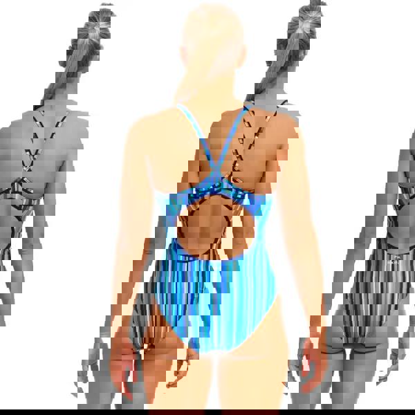 The Funkita Lane Lines Diamond Back Swimsuit has a double bind shoulder strap, edged in lime green, to make you feel secure and supported across the bust and shoulders, a medium leg height for modest rear coverage and a front lining for extra comfort. Made from 100% chlorine-resistant ECO C-Infinity fabric, for durability and long lasting colour. The stunning print features dynamic waves in shades of blue, so you can make a statement in the pool for your training sessions or leisure use.