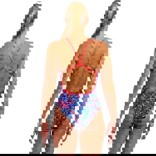 The Mad Cat Swim Secure (Period Proof) Swimsuit from Funkita features thin shoulder straps in coral with moderate leg height & rear coverage. This swimsuit includes discreet and absorbent gusset padding to offer light flow protection while on your period so you can continue to swim with confidence. The whole swimsuit is lined in a black fabric. Featuring a fun pattern of mixed up animal prints in black, blue and coral. Made from 100% chlorine-resistant ECO C-Infinity fabric for durability and long-lasting colours.