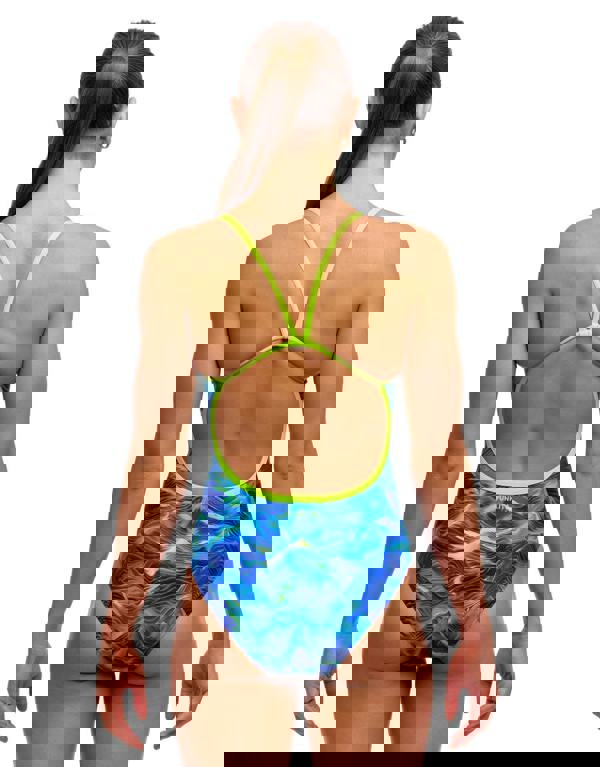 The Storm Chaser Single Strap Swimsuit from Funkita features a wavy tidal pattern in blues and cyan with highlights of neon green. The thin, single neon green strap provides freedom of movement and an exposed back design. The medium-cut leg and integrated front lining offer balanced coverage for everyday swimming. Built from Eco C-Infinity technology, this suit resists chlorine damage and maintains its integrity through countless laps, making it a reliable choice for dedicated pool swimmers.