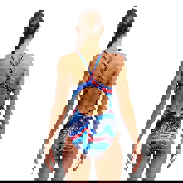 The Wave Craze Diamond Back Swimsuit from Funkita is designed with swirl patterns in blue and red. The diamond back design ensures freedom of movement and added support across the bust and shoulder with the double-bind shoulder straps and open back. Made from Eco C-Infinity fabric, it offers 100% chlorine resistance and great durability which making it perfect for frequent swimming.