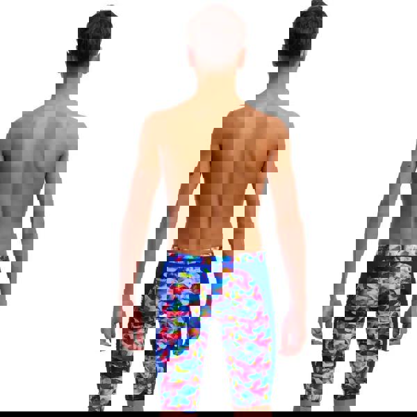 The Boys Wet Wave Swim Training Jammer by Funky Trunks combines style and performance for regular swim training. Featuring a striking splashy print in blues, pinks, yellow and green, it has blue panels down each leg. Offering a secure fit with a drawcord, wide elastic waistband, and leg openings. Crafted from Chlorine-resistant Eco C-Infinity fabric, these jammers ensure lasting durability and maintain their shape and colour despite frequent exposure to chlorinated water. Ideal for young swimmers aiming for comfort and endurance in every session.