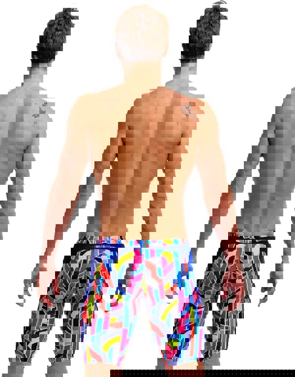 Built for serious swimmers, the Fault Lines Swim Training Jammer from Funky Trunks, features geometric patterns in blue, pink and lime greens, there is a bright blue dynamic panel down one side, delivers visual appeal. The ECO C-Infinity fabric resists chlorine degradation whilst maintaining its integrity through intensive training regimens. Generously cut leg openings reduce restriction during extended pool sessions, whilst the reinforced waistband with drawcord adjustment ensures stability without compromising comfort.
