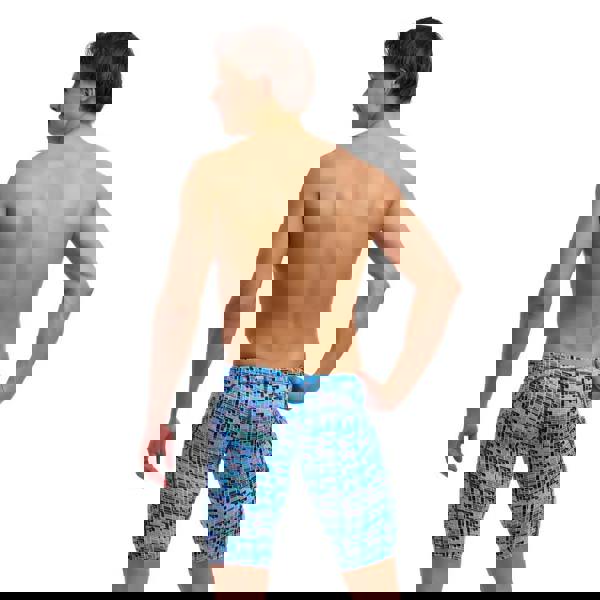 The Jack Stack Swim Training Jammer from Funky Trunks is designed with stylish geometric patterns in blue and is perfect for recreational or performance-based swimming. The wide elastic leg opening provides comfort, and the wide waistband with drawcord ensures a secure fit. The jammer is made from ECO C-Infinity fabric, which offers high chlorine resistance and great durability.