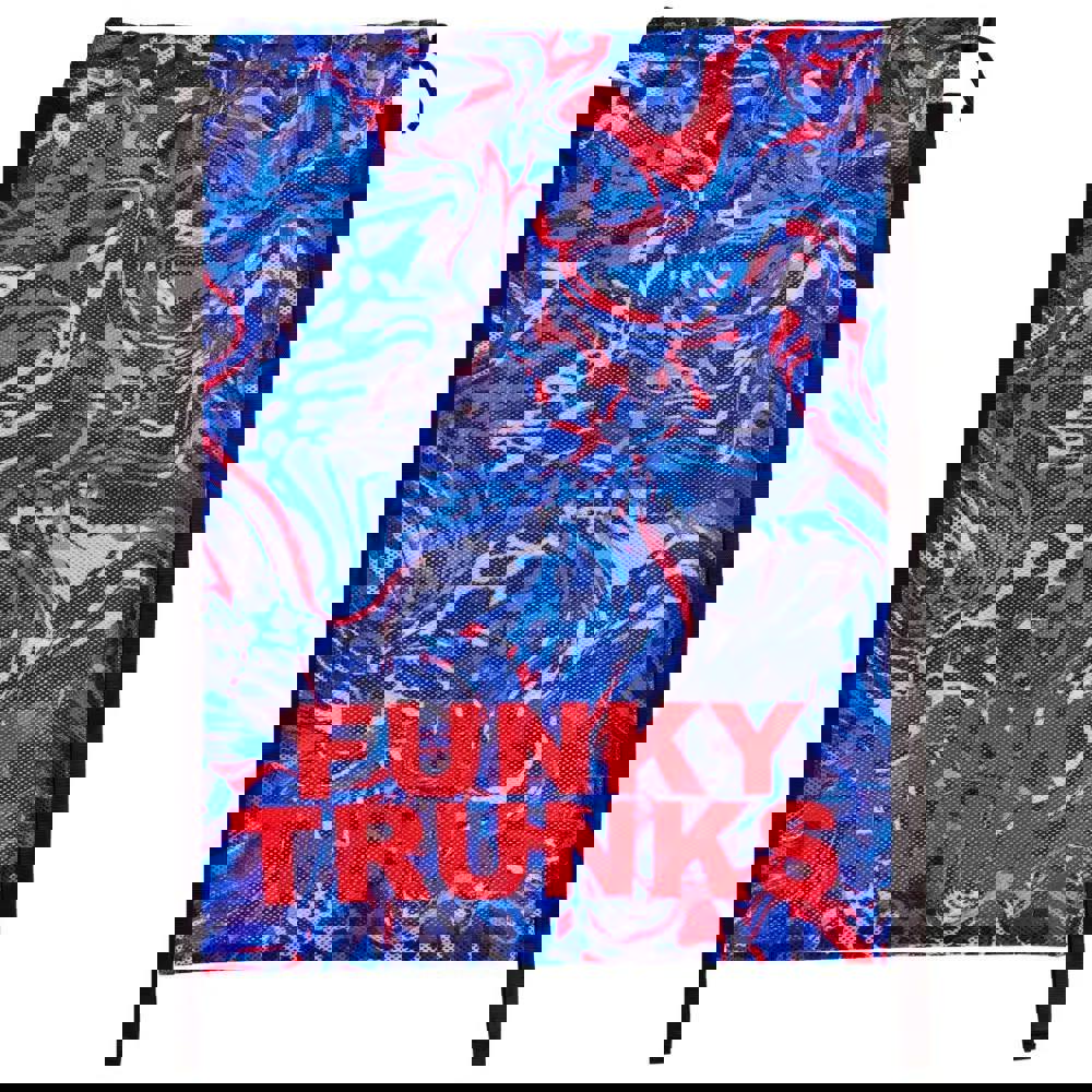 The Mad Cat Mesh Gear Bag from Funky Trunks combines bold abstract animal prints in blue, red, and black with practical design to meet all your swimming gear needs. Its spacious convenient drawstring opening allow quick and easy access, while the comfortable shoulder straps make carrying effortless. Crafted from strong, breathable mesh, this durable bag lets water drain quickly and air to circulate, helping your wet gear dry naturally and stay fresh. Whether heading to the pool or beach, this gear bag offers both style and functionality to keep your essentials organised and ready for action.