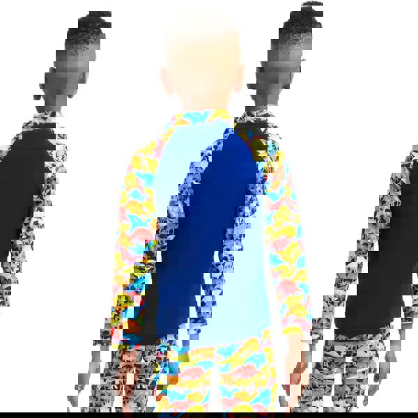 The Toddler Boys Swimmasaurus Zippy Rash Vest from Funky Trunks is a loose fitting, raglan sleeved rash vest with a half-length front zip and comfortable collar. With fun brightly coloured dinosaurs on a bright blue background, it is sure to increase your street cred at the pool. Made with C-Infinity fabric for long lasting colour and UV50+ for sun protection.
