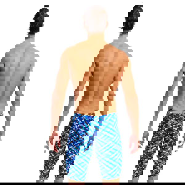 Designed for consistent swim training, the Under Over Swim Training Jammer by Funky Trunks showcases an eye-catching blue geometric design. Its broad elastic leg openings enhance comfort during long sessions, while the wide waistband with adjustable drawcord guarantees a snug and reliable fit. Crafted from ECO C-Infinity fabric, this jammer delivers excellent chlorine resistance and lasting durability, making it a smart choice for swimmers seeking performance and style.