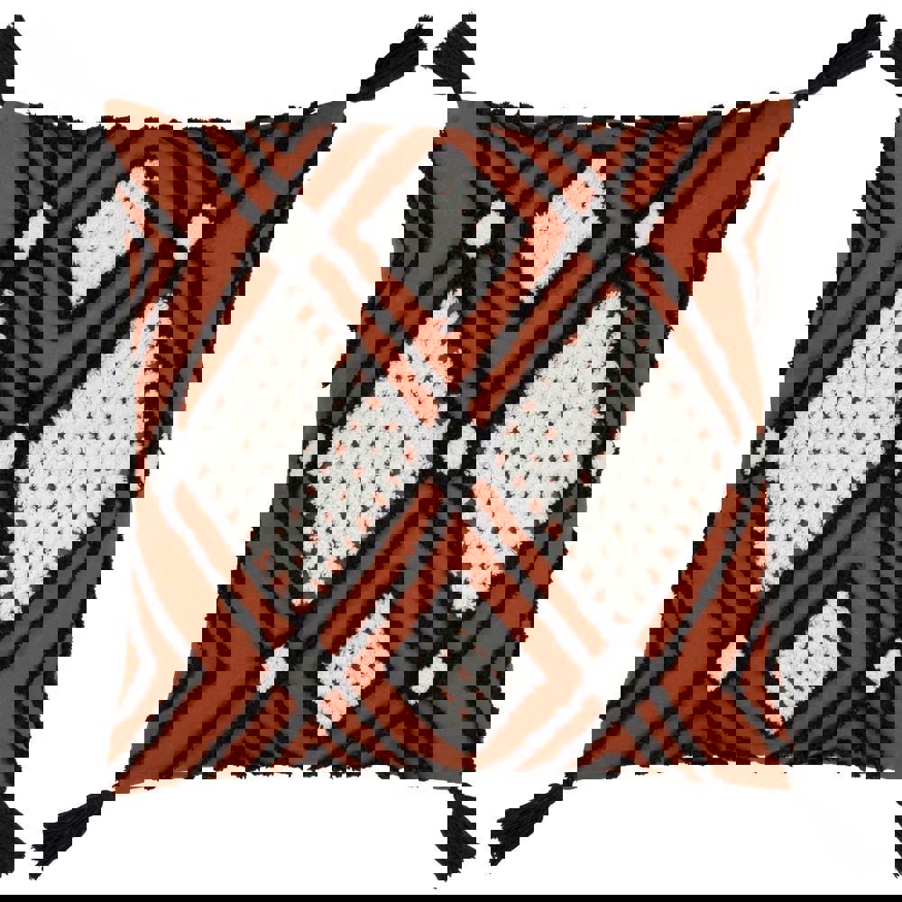 Featuring a contrast design with diamond and geometric line detailing, this cushion cover is finished with tufted accents, tassels and a square shape. The reverse is plain for a cleaner look when you want a more understated finish. A zip fastening makes it simple to fit and remove as needed. Please note: insert not included.