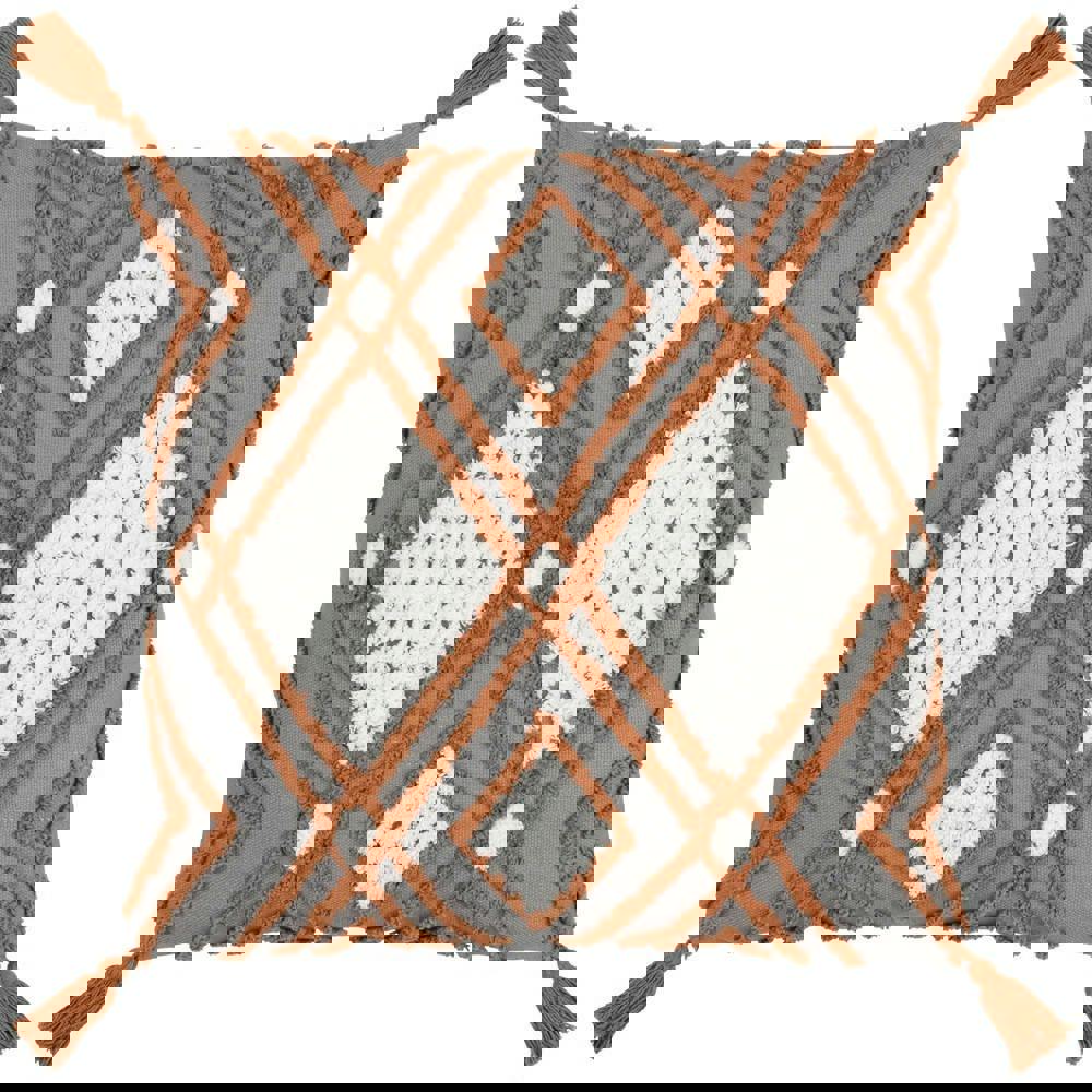Featuring a geometric diamond pattern with square and line elements, this cover is finished with tufted detailing and tassels for a tactile look. A plain reverse keeps the overall design versatile, while the zip fastening makes it simple to fit and remove when you want to switch up your styling.